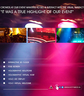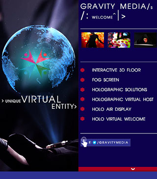 GRAVITY MEDIA SOLUTIONS* - GMS’ works with leading brands to create unique event experiences and manages many aspects of its portfolio from concept and design, to set-up, visuals creation and visual updates via special proprietary software and consoles, ensuring that its experiences meet and exceed the highest expectations of today’s visitors and audiences.
