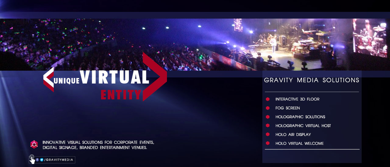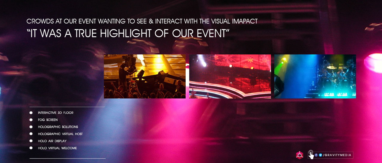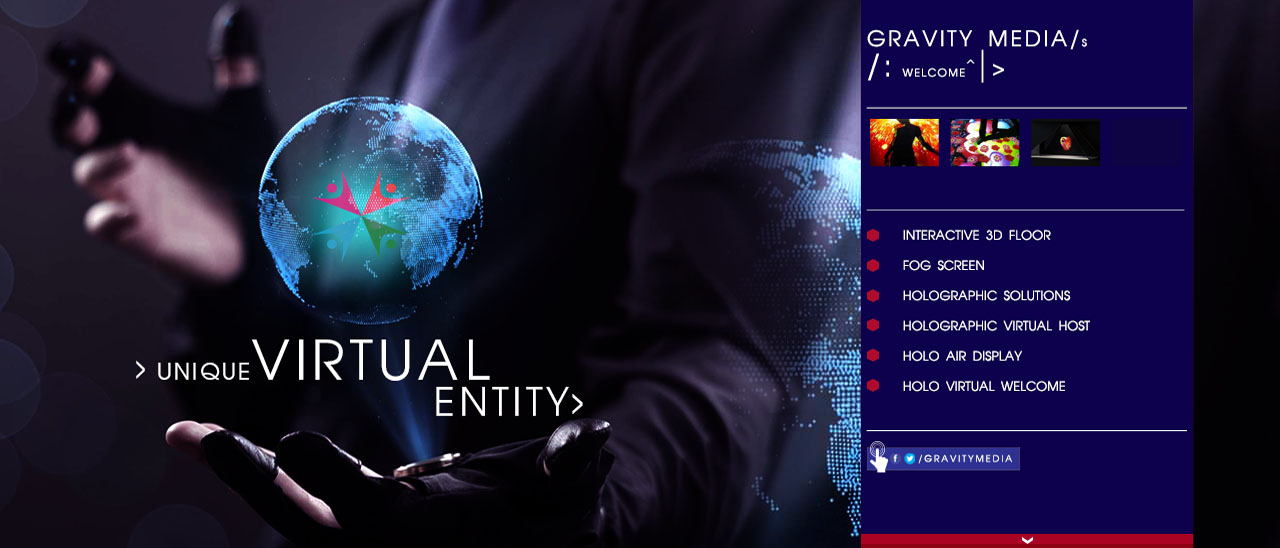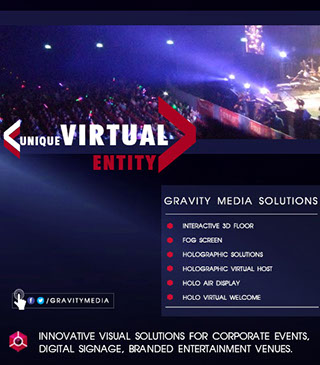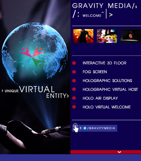 GRAVITY MEDIA SOLUTIONS* - GMS’ works with leading brands to create unique event experiences and manages many aspects of its portfolio from concept and design, to set-up, visuals creation and visual updates via special proprietary software and consoles, ensuring that its experiences meet and exceed the highest expectations of today’s visitors and audiences.